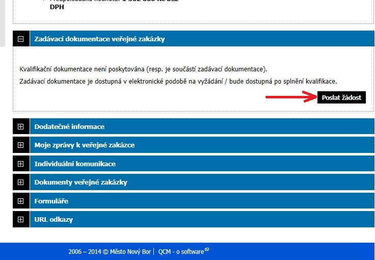 V případě, že nemáte přilohu k dispozici, klikněte v sekci zadávací dokumentace veřejné zakázky na tlačítko poslat žádost, viz obrázek v přiloze, a příloha Vám bude neprodleně zpřístupněna.